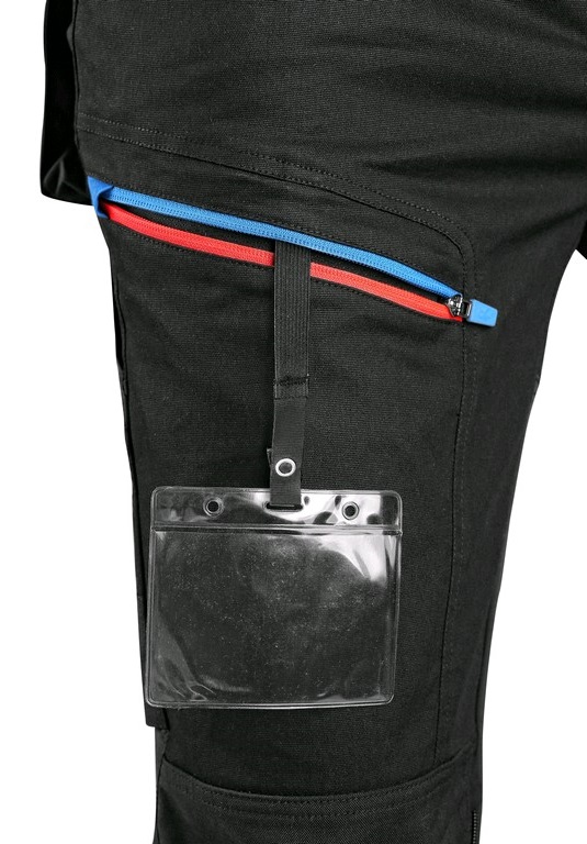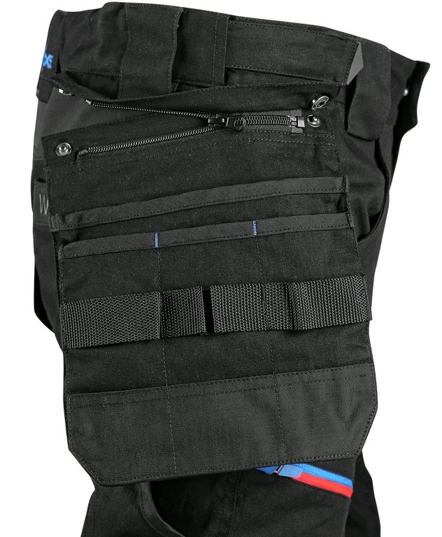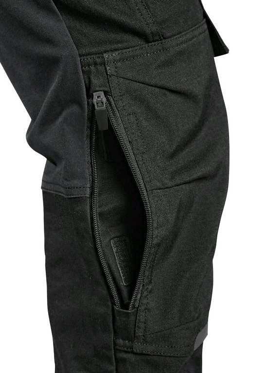Pánske pracovné nohavice s doplnkami z materiálu CORDURA. Pružný materiál zaručuje voľnosť pohybu. Flexibilný pás s možnosťou upravenia veľkosti, 2x predné vrecka, 2x odopínacie vrecka na náradie spevnené materiálom CORDURA, stehenné vrecka so zipsom a možnosťou vetrania, bočné vrecko so zipsom, 2x zadné vrecka. Ergonomický tvarované kordurou zosílené kolená s možnosťou vloženia kolenných výstuh z boku. Spodný lem vystužený Cordura páskou. Odoberateľné puzdro na karty v pravom stehennom vrecku.Nohavice umožňujú predĺženie na vyššiu postavu uvolnením šitia na spodku.